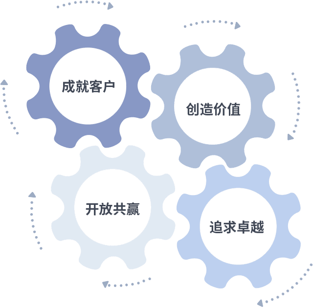 成就客户是一切决策的出发点,,,创造价值是衡量所有工作的标准,,,,追求卓越是我们做事做人的态度,,,,开放共赢是我们的格局也是最终的结果。。。。价值观的齿轮环环相扣,,推动着组织里的每个人不断向前。。
