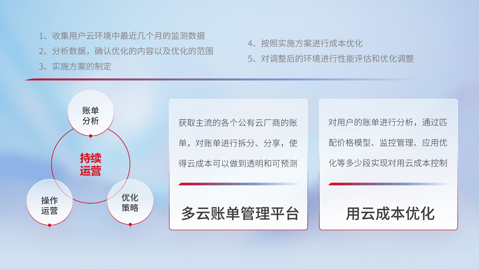 通过多云纳管,,,以统一的资源数据模型把客户的云资源进行抽象和封装,,,,进而实现对多云资源的统一操作,,保障云资源管理的可靠性、、稳定性与可用性。。量身定制化运维内容,,,,配置、、、开发运维、、、补丁管理、、、、备份、、、监控、、、、认证和访问管理、、审计和日常巡检等,,,,保障在用云过程中的可靠度,,稳定度以及高可用率。。。。